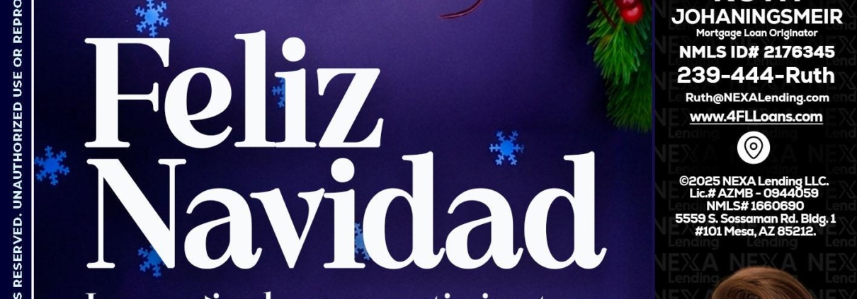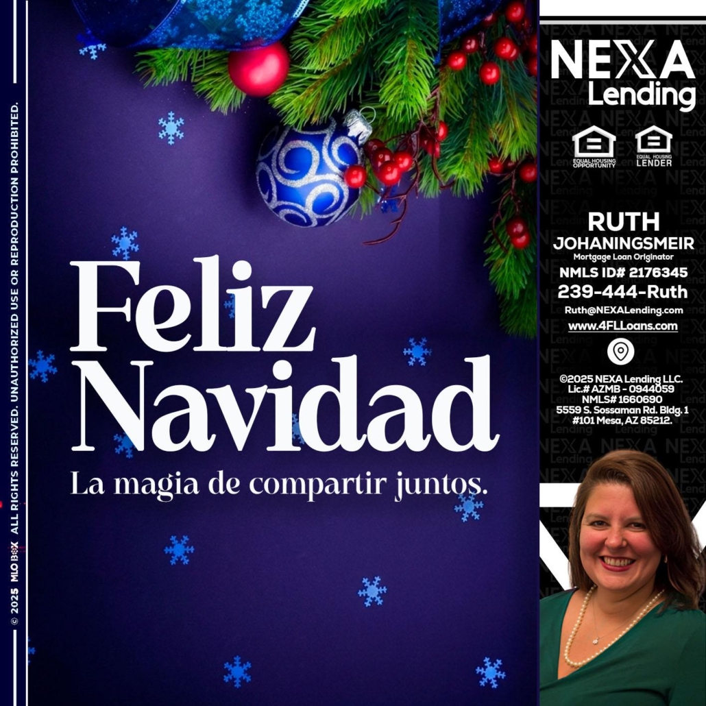 FELIZ NAVIDAD - Ruth Johaningsmeir -Mortgage Loan OriginatorHi, my name is Ruth Johaningsmeir. I’m a Loan Officer with NEXA Lending LLC., offering personalized mortgage solutions, fast customized quotes, great rates and service with integrity.