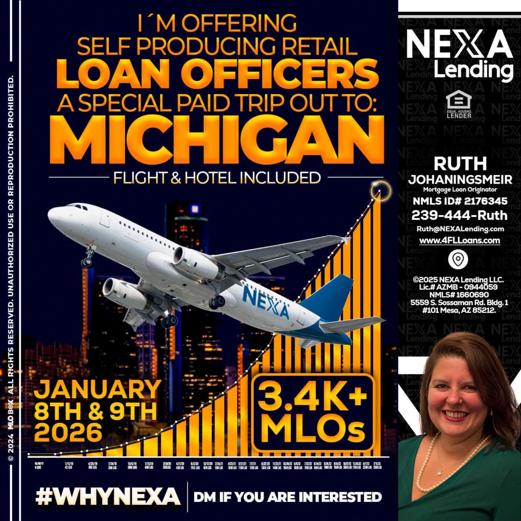 MICHIGAN TRIP - Ruth Johaningsmeir -Mortgage Loan OriginatorHi, my name is Ruth Johaningsmeir. I’m a Loan Officer with NEXA Lending LLC., offering personalized mortgage solutions, fast customized quotes, great rates and service with integrity.