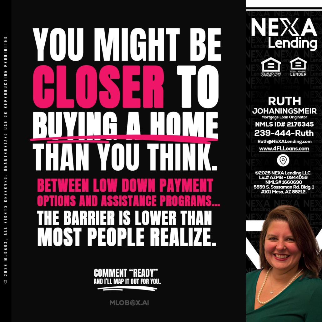 YOU MIGHT BE - Ruth Johaningsmeir -Mortgage Loan OriginatorHi, my name is Ruth Johaningsmeir. I’m a Loan Officer with NEXA Lending LLC., offering personalized mortgage solutions, fast customized quotes, great rates and service with integrity.